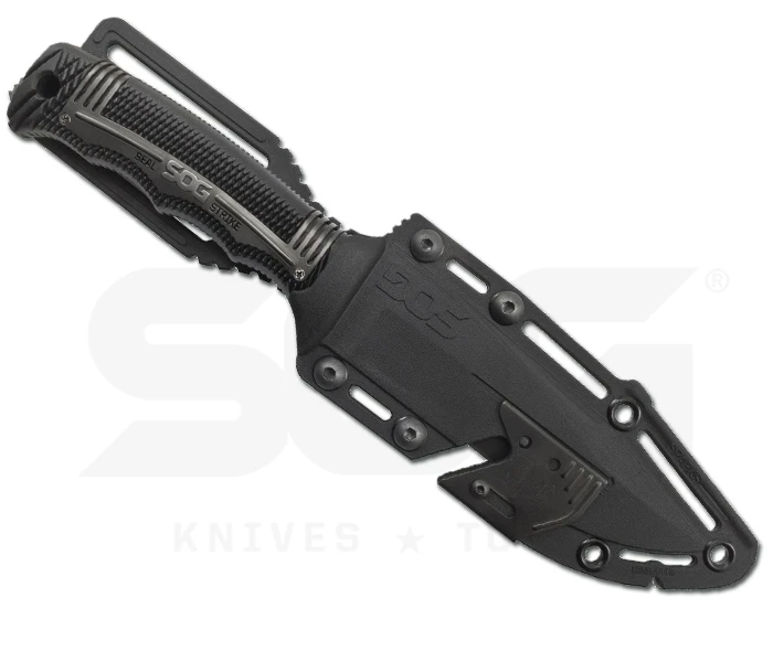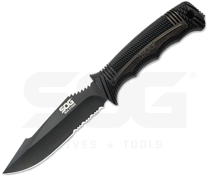 SEAL STRIKE ist ein Mitglied der bekannten SEAL-Serie von SOG aus den USA. Aus dem jahrelangen Feedback der Sealsgemeinde entwickelte SOG dieses Messer. Taktisch oder im Outdoorbereich sowie auch unter Wasser fühlt es sich heimisch. Die Titanium-Nitrid (Black TiNi) beschichtete Klinge des Seal Strike wurde aus AUS-8 Stahl gefertigt. Die Beschichtung schützt die Klinge vor Witterungseinflüssen und minimiert Lichtreflexe. Weitere Features wie die Teilsägezahnung und die griffige Daumenauflage erweitern die Einsatzmöglichkeiten. Dank der Fingermulden und dem glasfaserverstärkten Nylongriff mit Edelstahl liegt das Messer sicher in der Hand. Am Griffende sitzt ein Schlagstück. Auch eine Fangschnur kann am Griffende befestigt werden. Zum Transport dient eine taktische Spezialscheide mit einem kleinen Schärfer, einem integrierten Feuerstarter und bei steckendem Messer ein Cutter, der durch einen Schieber gesichert wird. Die Scheide kann universell an der Kleidung oder Ausrüstung befestigt werden.