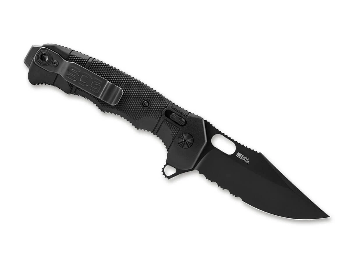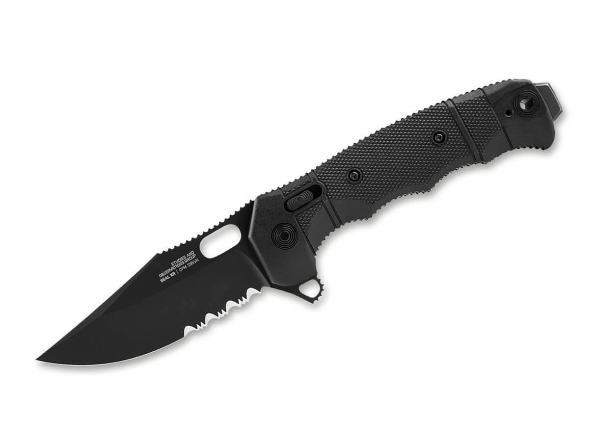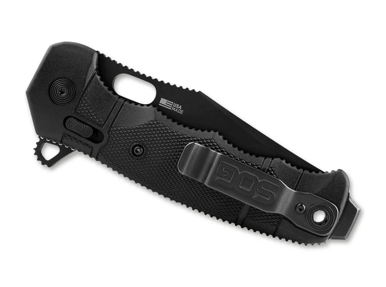 Das SEAL XR von SOG wurde in Zusammenarbeit mit professionellen Einsatzkräften entwickelt, getestet und optimiert. Das stabile Taschenmesser steht den feststehenden SEAL Modellen in Bezug auf Sicherheit und Funktionalität in nichts nach und überzeugt insbesondre mit hoher Korrosionsbeständigkeit und hervorragender Schnitthaltigkeit. Die Klinge wird per Daumenöffnung oder Flipper geöffnet und durch den zuverlässigen XR-Lock gesichert, der über den seitlichen Schieber im Griff leicht und komfortabel zu bedienen ist. Die schwarze Klinge mit Teilwellenschliff wird aus pulvermetallurgischen CPM-S-35VN gefertigt und ist mit einer widerstandsfähigen Cerakote- Beschichtung versehen. Der Griff besteht aus rutschfestem, strukturiertem GRN und liegt stets sicher in der Hand, das hervorstehende Griffende ist als Hammerfläche ausgeformt. Zusätzliche Riffelungen am Klingen- und Griffrücken erhöhten die Arbeitssicherheit. Mit umsetzbarem Clip (Tip-up/l-r). Made in USA.