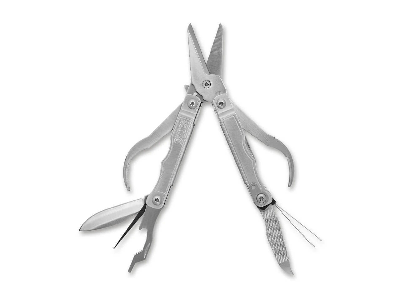 Mit dem Snippet bietet SOG ein Scheren-Multitool der Einstiegsklasse an, bei dem eine besonders sichere Handhabung der Schere im Vordergrund steht. Die zusätzlichen Fingerbügel ermöglichen die komfortable Nutzung der Schere in gewohnter Manier und ohne Gegendruckfeder, für ein möglichst großes Feingefühl beim genauen Arbeiten. Zusätzlich verfügt das als Ganzstahlkonstruktion ausgeführte Multitool über eine Klinge aus 5Cr15MoV, einen Flaschenöffner, einen kleinen Schlitzschraubendreher, einen Nagelreiniger mit Feile, eine Pinzette und einen Zahnstocher.