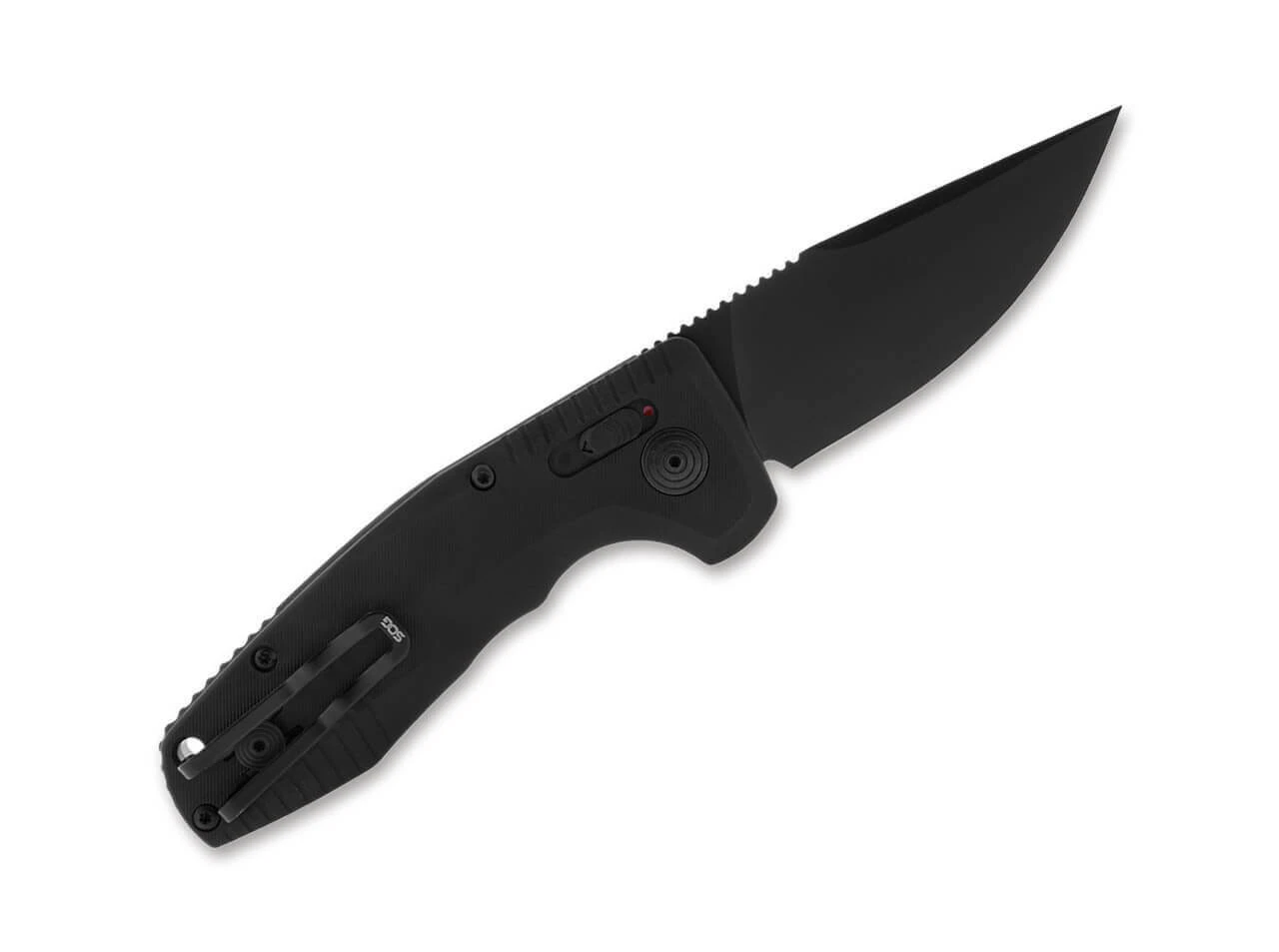 Taktisch, praktisch, vielseitig – so lässt sich das kompakte SOG-TAC AU als effizientes Alltags- und Einsatzmesser zusammenfassen. Per Knopfdruck öffnet die schwarz beschichtete Klinge aus D2 und ist direkt da, wo man sie braucht. Die Bauweise erlaubt eine perfekte Nutzung für Rechts- und Linkshänder, da Druckknopf sowie Verriegelungsknopf beidseitig im texturierten Aluminiumgriff erreichbar sind. Der bei SOG bekannte XR Lock arretiert die Klinge nicht nur zuverlässig während der Nutzung, sondern verhindert darüber hinaus ein versehentliches Öffnen des Messes. Mit Fangriemenöse und umsetzbarem Tip-Up Clip.