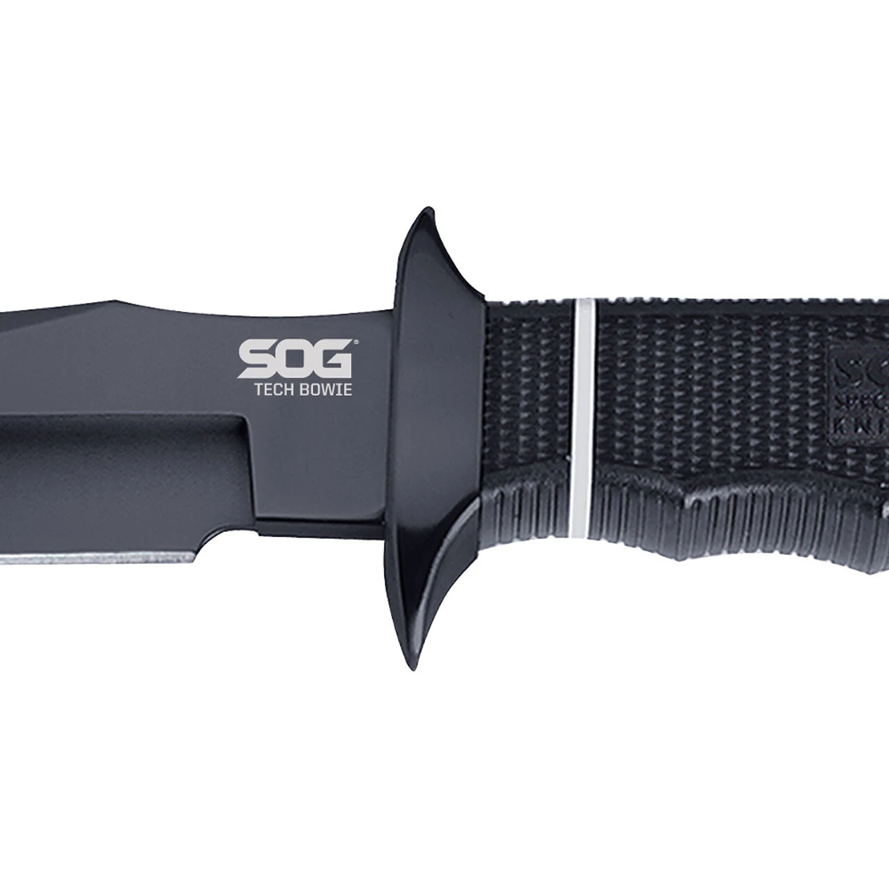 Wer ein Messer im Bowie-Stil mit moderner Handwerkskunst sucht, ist mit dem Tech Bowie von SOG bestens bedient. Das Tech Bowie wurde durch den Einsatz aktueller Technologien und Materialien in ein hochwertiges Arbeitsmesser verwandelt. Alle Metallteile, einschließlich Klinge, Parierstange und Knauf, sind durch eine harte schwarze TiNi-Beschichtung geschützt.
